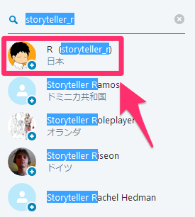 《Skypeを検索》をクリックすると、候補またはピンポイントでアカウントが表示されます。