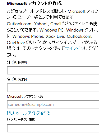 新しくアカウントを作る場合は《アカウントの作成》から次に進んでいきます。アカウントを作るために必要な情報を記入する画面が出てきますので、記入項目に従い、必要事項を入力していきましょう。