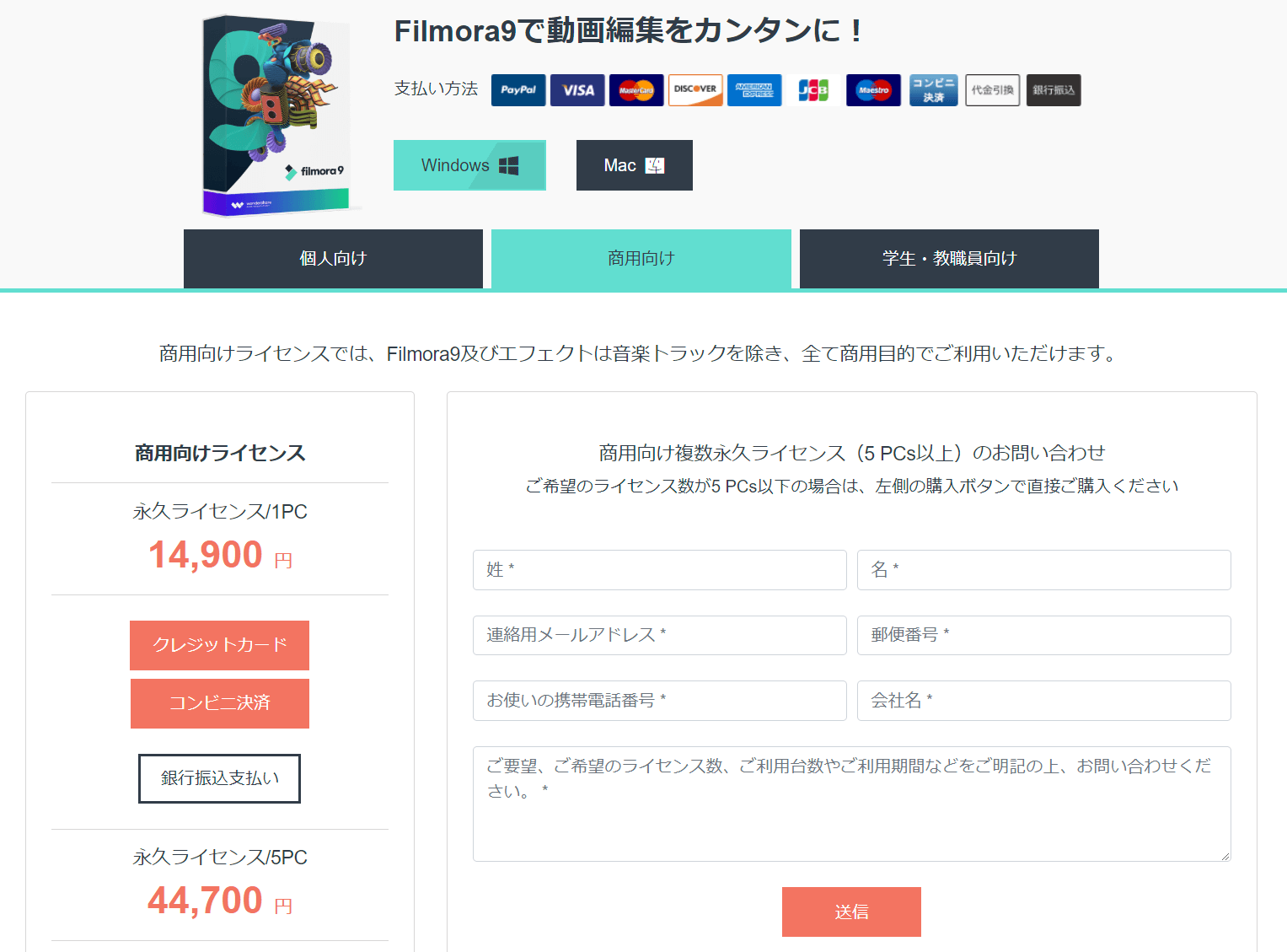 『個人向け』ではなく『商用向け』を選び、以下のページから商用ライセンスが与えられたFilmora9を買う必要があります。