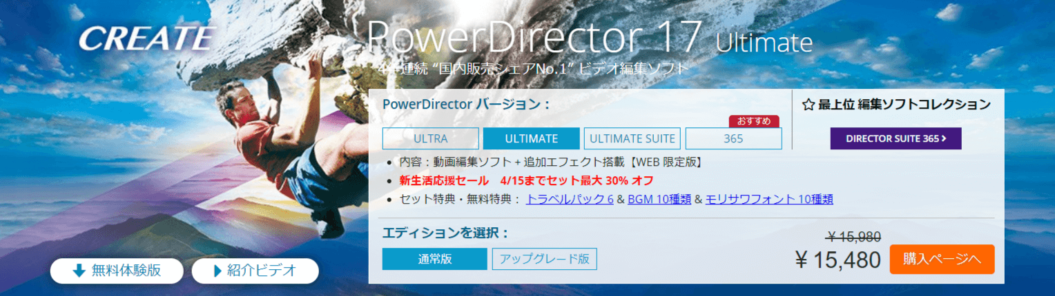 | 主な機能 | タイトルエフェクト/豊富なフォント/コラージュ/クロマキー合成/モーショントラック/さらに詳しく→ https://jp.cyberlink.com/products/powerdirector-video-editing-software/features_ja_JP.html?affid=2581_1369_540 |